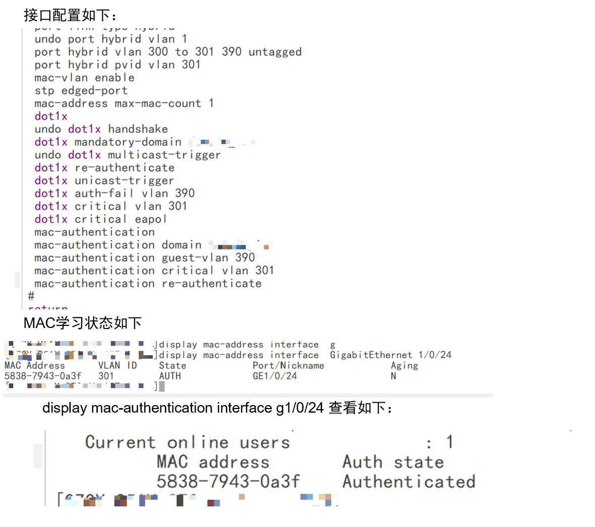 display mac-authentication interface g1/0/24看是已经通过了mac认证