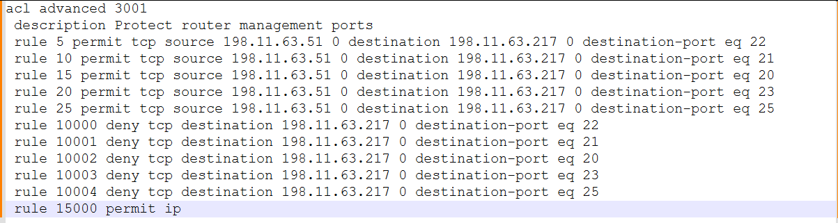 路由器都是接口ip,漏扫需求关闭很多高危端口,禁止内网所有ip访问any的所有高危端口,只允许个别ip可以访问这些端口是不是如下配置