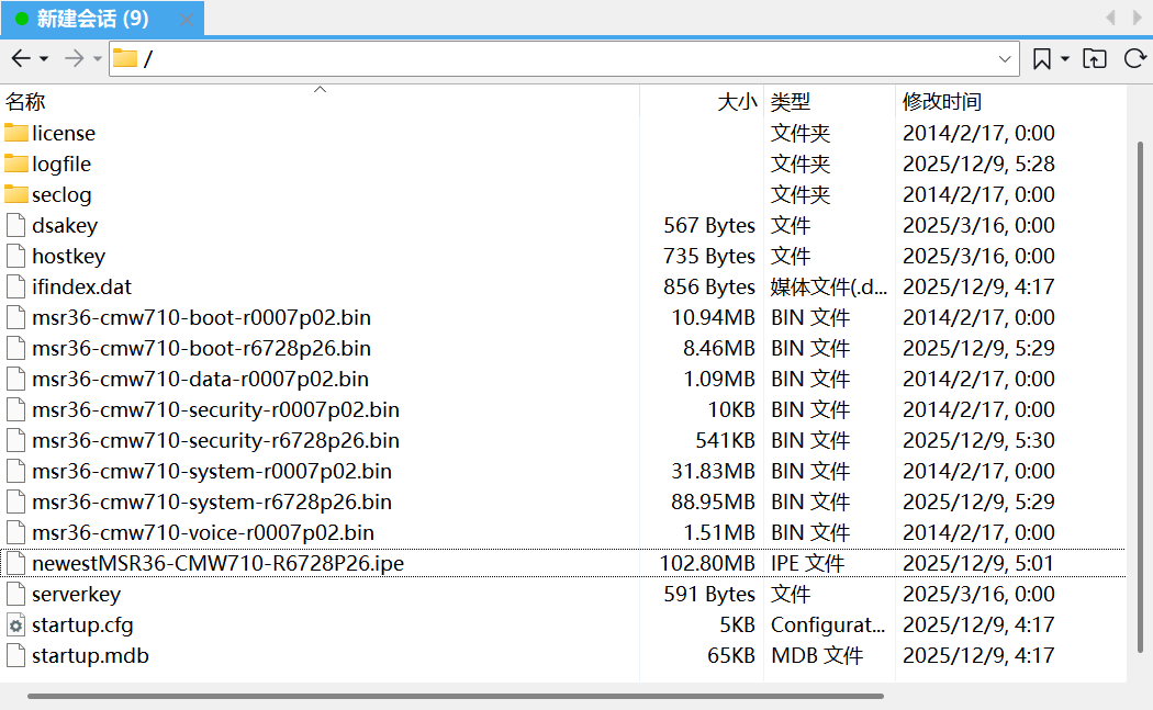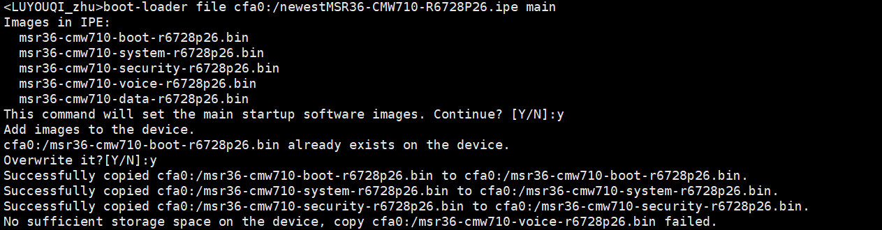 display disk-usage # 检查文件系统碎片 fixdisk cfa0: # 查看当前文件列表及大小 dir cfa0:/# 1. 先上传必要的组件文件 tftp 192.168.1.100 get msr36-cmw710-boot-r6728p26.bin tftp 192.168.1.100 get msr36-cmw710-system-r6728p26.bin tftp 192.168.1.100 get msr36-cmw710-security-r6728p26.bin # 2. 设置启动文件 boot-loader file cfa0:/msr36-cmw710-boot-r6728p26.bin main boot-loader file cfa0:/msr36-cmw710-system-r6728p26.bin main boot-loader file cfa0:/msr36-cmw710-security-r6728p26.bin main # 3. 重启后上传剩余组件 tftp 192.168.1.100 get msr36-cmw710-voice-r6728p26.bintftp 192.168.1.100 get msr36-cmw710-data-r6728p26.bin # 4. 设置完整的启动镜像 boot-loader file cfa0:/newestMSR36-CMW710-R6728P26.ipe main# 使用USB存储设备 copy cfa0:/newestMSR36-CMW710-R6728P26.ipe usba0:/ boot-loader file usba0:/newestMSR36-CMW710-R6728P26.ipe main<LUYOUQI_zhu>dir cfa0:/ # 查看可用空间大小 <LUYOUQI_zhu>display version # 确认当前版本,确保有回退保障# 删除旧版本文件(注意保留当前运行版本) <LUYOUQI_zhu>delete cfa0:/msr36-cmw710-voice-r0007p02.bin <LUYOUQI_zhu>delete cfa0:/msr36-cmw710-data-r0007p02.bin # 保留当前运行的版本文件,只删除旧版本