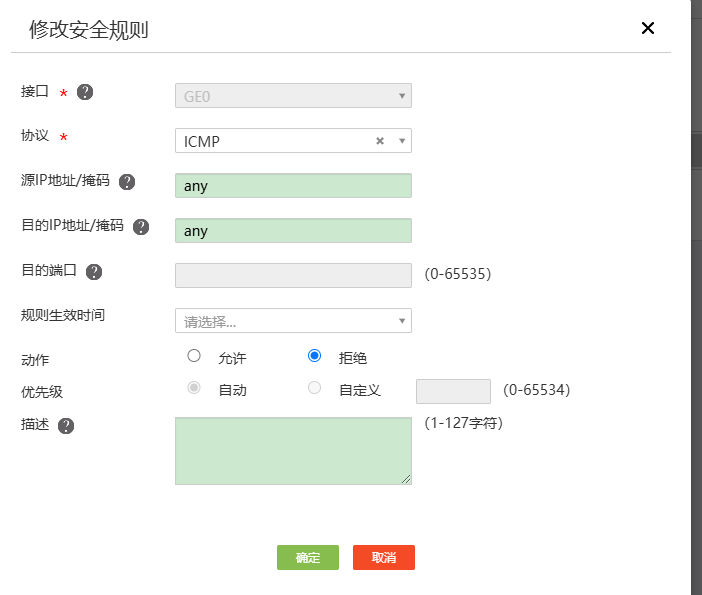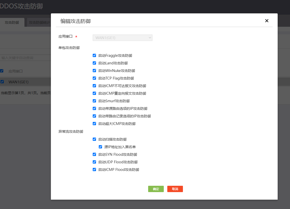 你好,防火墙GE1,GE2都设置了上面的ICMP拒绝,DDOS攻击防御也打开了,配置的正确嘛?其它还有什么需要设置的