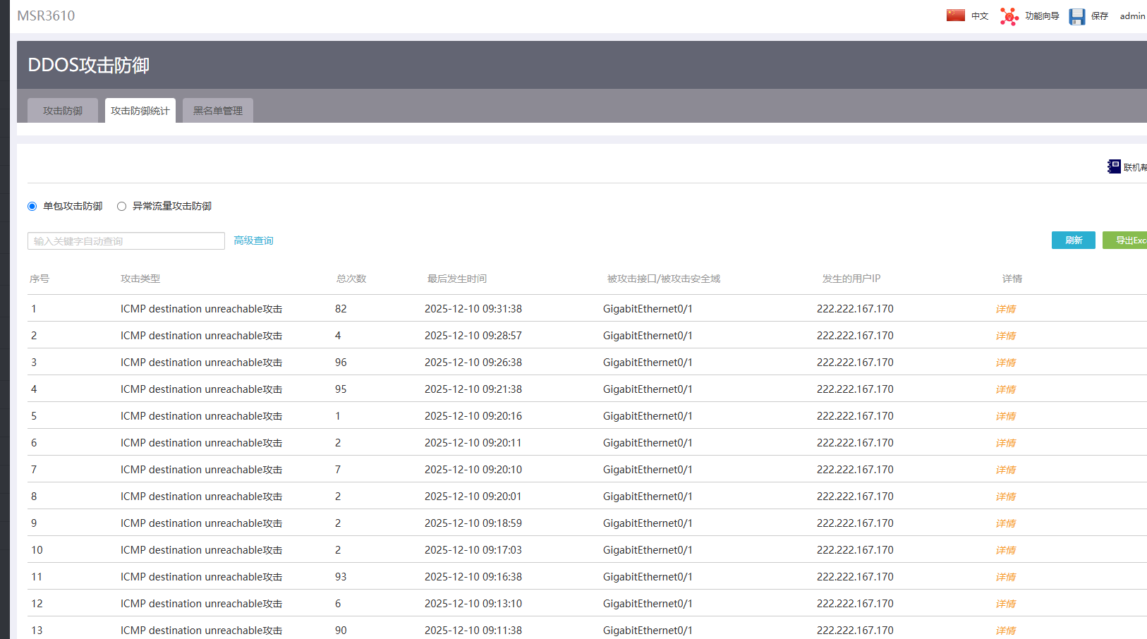 2 图二策略是记录异常流量的源地址到黑名单,但图三的是单包攻击筛选出来的类型吗,可能是类型没有匹配上策略导致不能加黑名单