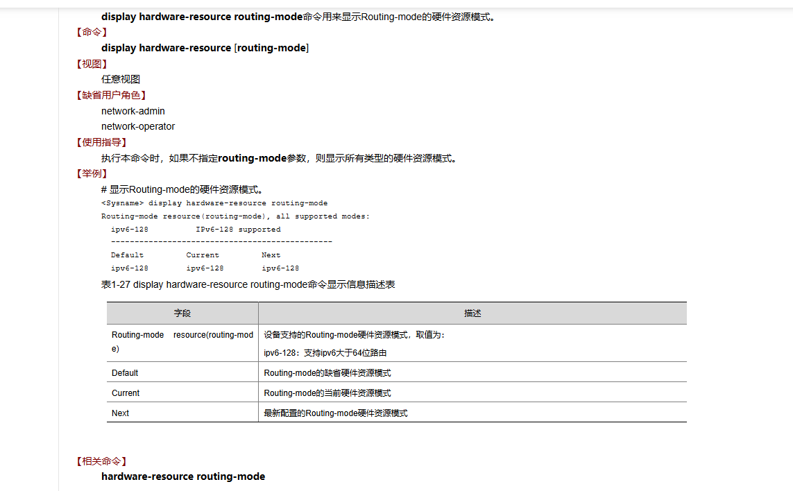 例如,在 **《S6800系列交换机硬件资源分配指导手册》** 中,可搜索“ipv6-128”或“routing-mode”查看资源占用详情。