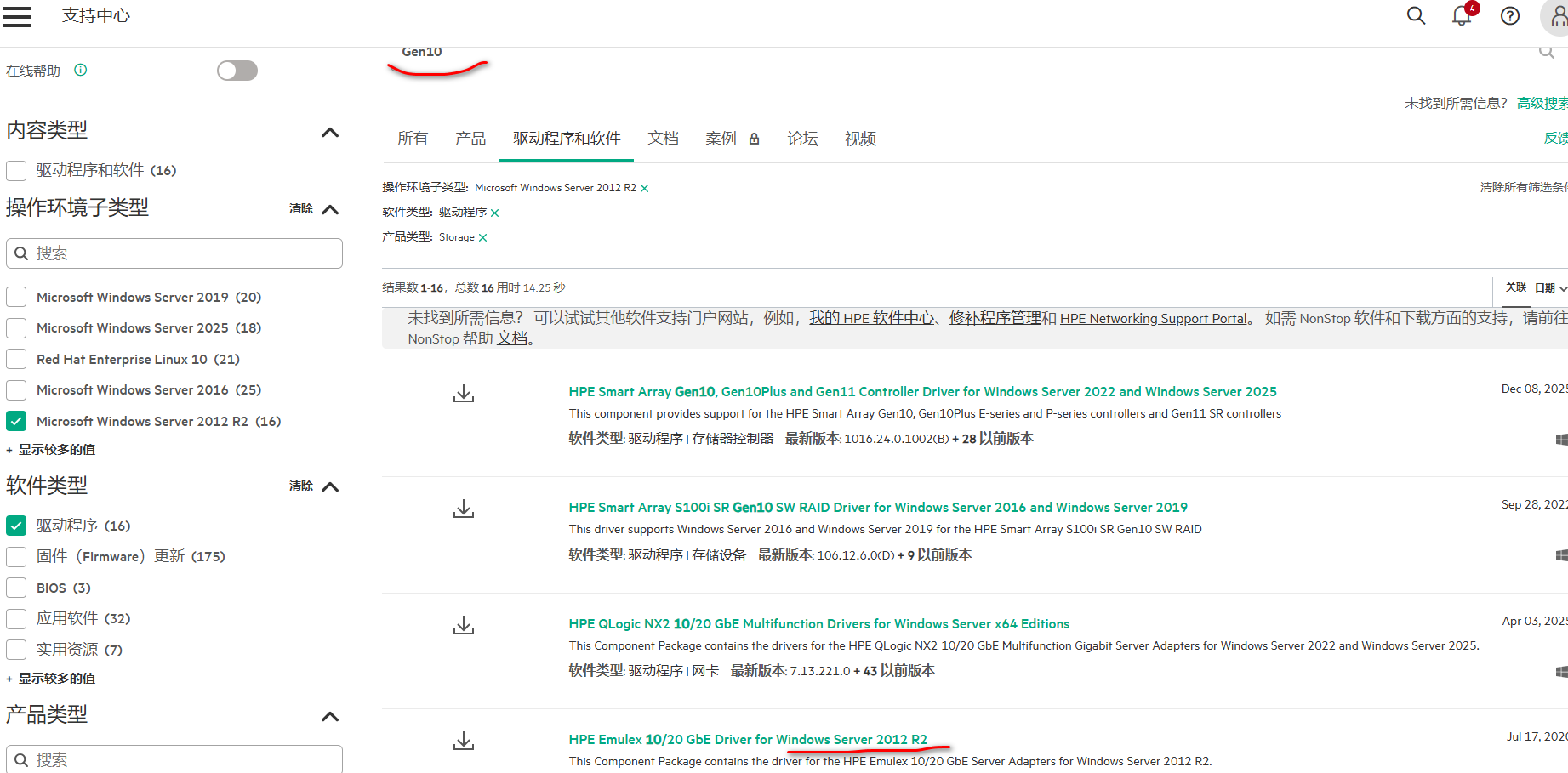 https://support.hpe.com/connect/s/search?language=zh_CN&archive=false#q=Gen10&t=DriversandSoftware&sort=relevancy&numberOfResults=25&f:@kmswtargetenvirOnment=[Microsoft%20Windows%20Server%202012%20R2]&f:@kmswsoftwaretypekey=[swt8000113]&f:@kmtargetproductl1l5namelist=[Storage]