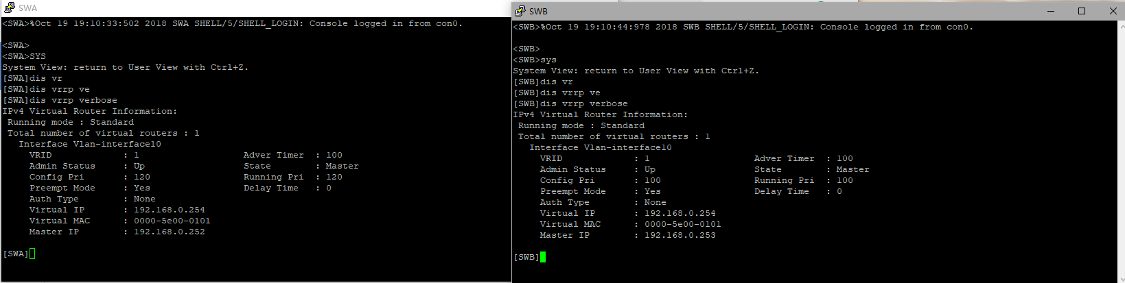 在a带源ping一下b的vlan10地址 测试一下连通性。master选举是先比较优先级然后再比较ip地址。如果没有配置优先级就比较ip地址 地址大的选举为master设备。