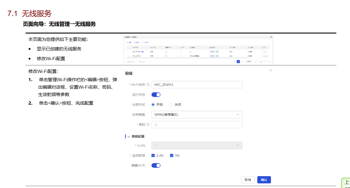 大家好,本人是小白,目前所在的中小型企业使用的型号是H3C UR7504,使用人数大约7层楼70人,目前的系统版本是ESS 0133P01(系统提示已为最新版本),想修改一下相关无线配置,目前网络使用是正常的,一个WiFi名是ABC,另一个是ABC_5G,应领导要求修改一下WiFi名和密码,可由于网络知识极度匮乏,找不到修改WiFi名称和密码的地方。
