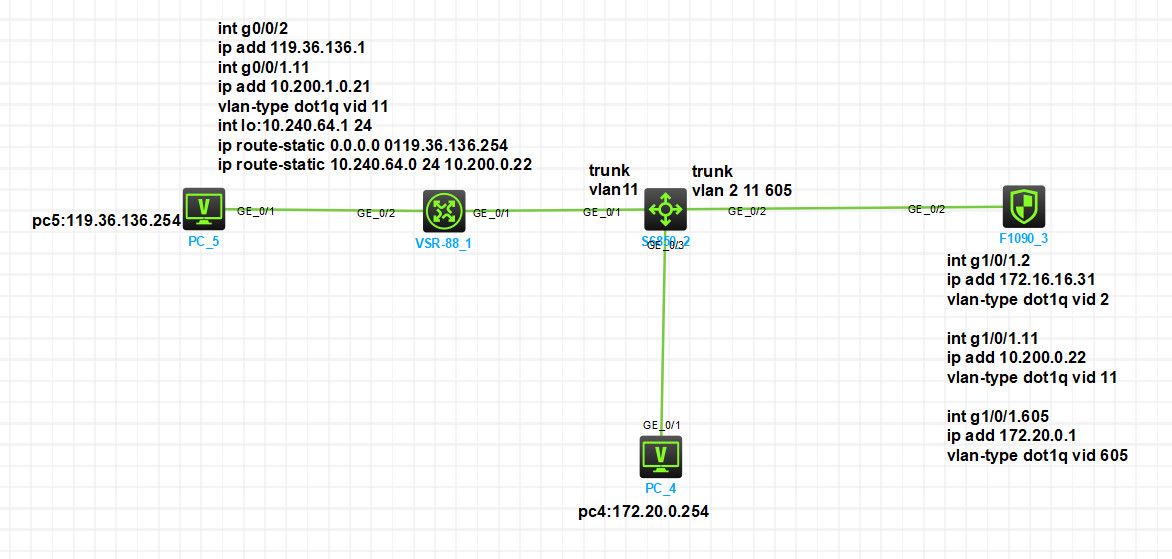 左边的PC模拟的是互联网,旁边的路由器的是模拟BRAS,lo接口模拟BRAS上能上网的地址,通过g0/0/1.11的子接口连接交换机和防火墙的1/0/2.11三层互联,拓扑上端口号标错了。互联后BRAS将10.240.64.0/24指向防火墙做NAT,防火墙做NAT后,在子接口1/0/2.605上启网关封装成VID605透传给交交换机,交换机1/0/3口ACCESS口605接PC4 172.20.0.254ping不通模拟互联网的PC5