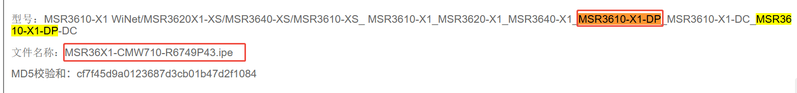 确认一下型号是MSR3610-X1-DP吧?可以去版本说明书里面搜索一下,有写明对应型号所需要的版本文件名字,然后对应去下载,比如MSR3610-X1-DP如下显示: