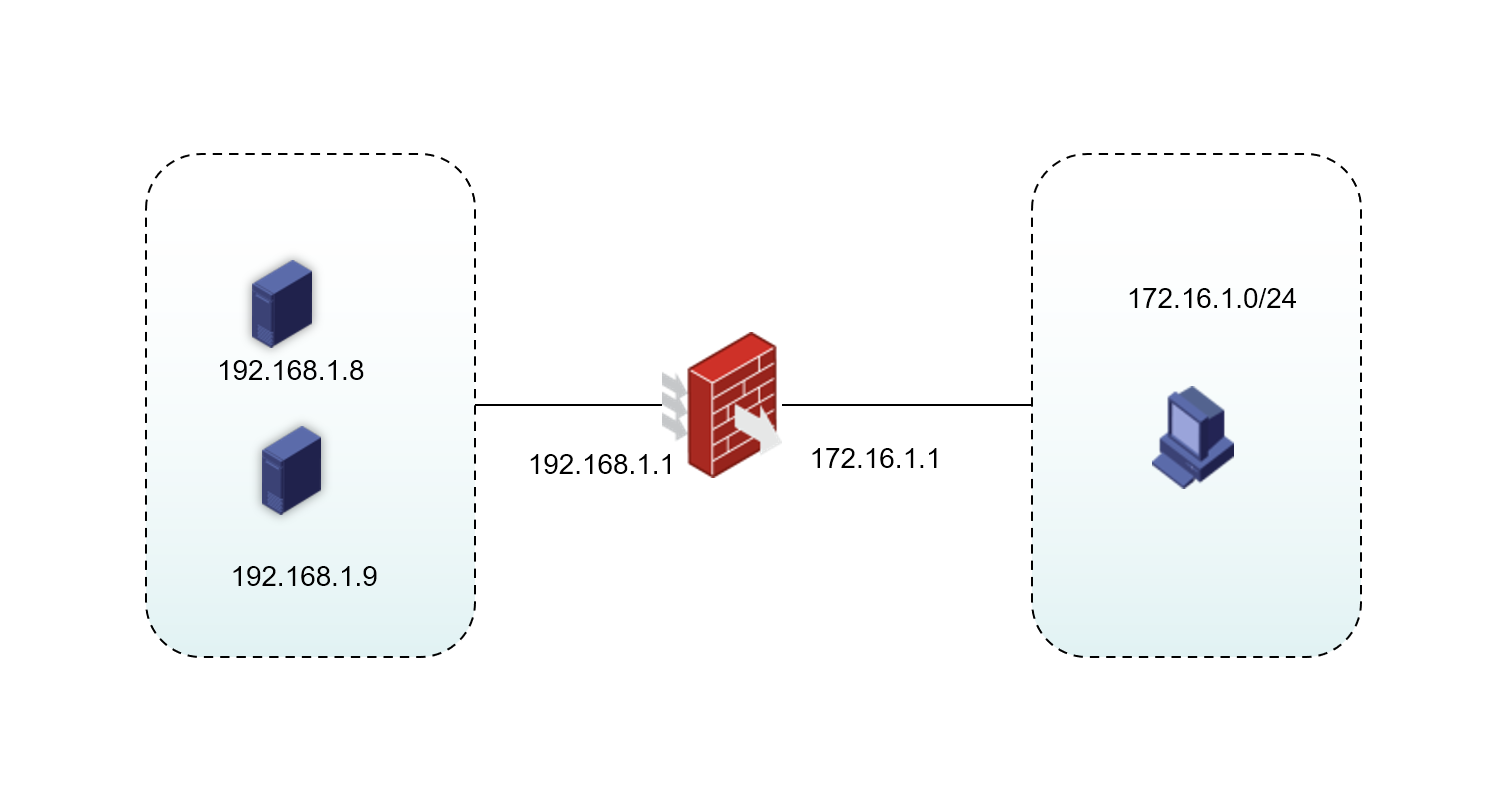防火墙1口的地址192.168.1.1/24 ,2口的地址是172.16.1.1/24,现在1口下面接了两台服务器,没有配置网关,2口下面接了一个172.16.1.0/24网段的主机设备,也不配置网关,现在两个网段的地址 需要通过防火墙的NAT互通,该如何配置