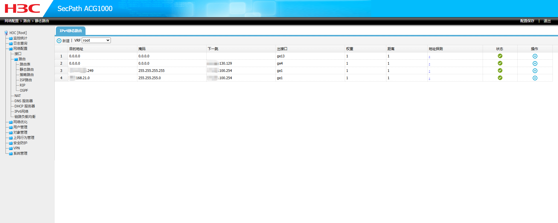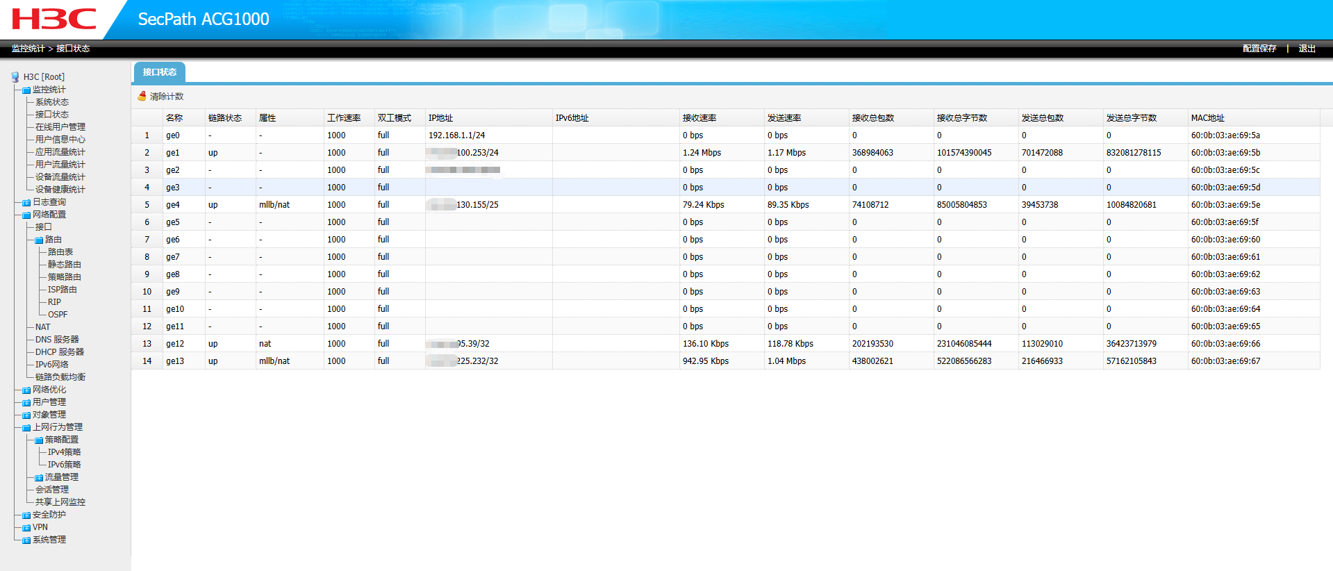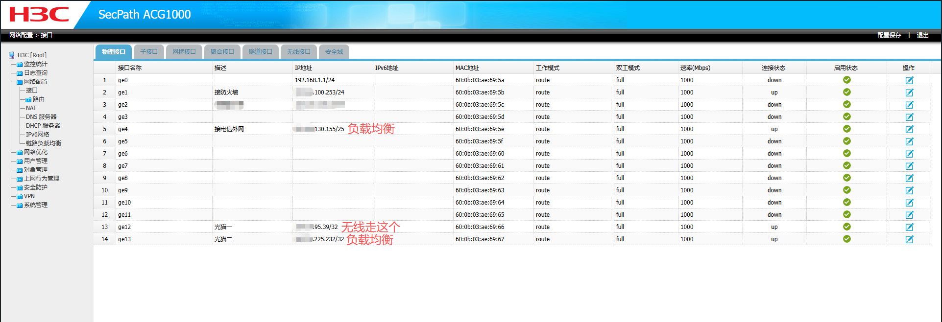 (1条专线固定IP+2个PPPOE拨号)。固定IP专线在GE4口,2条拨号分别在GE12,GE13。