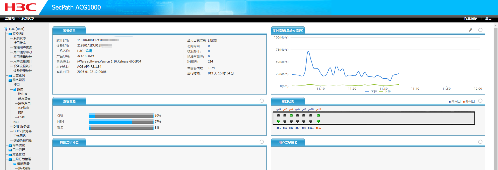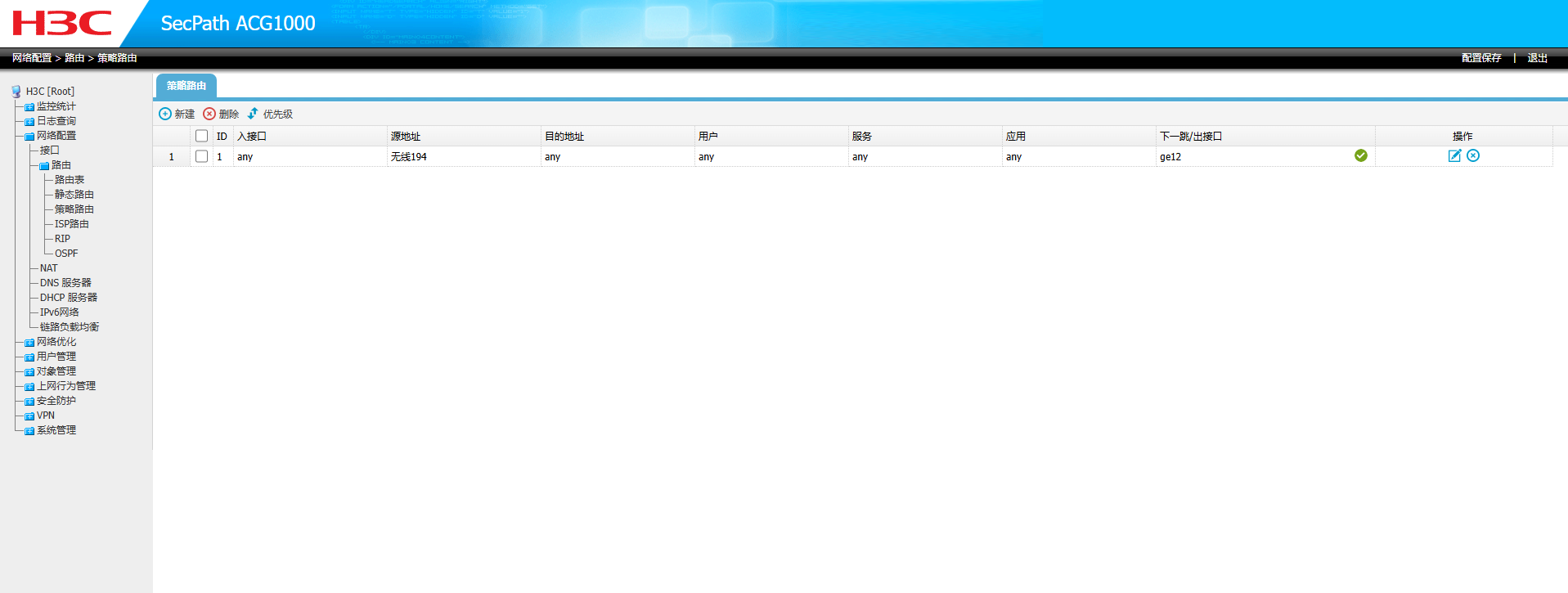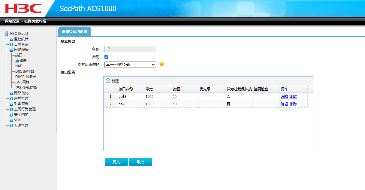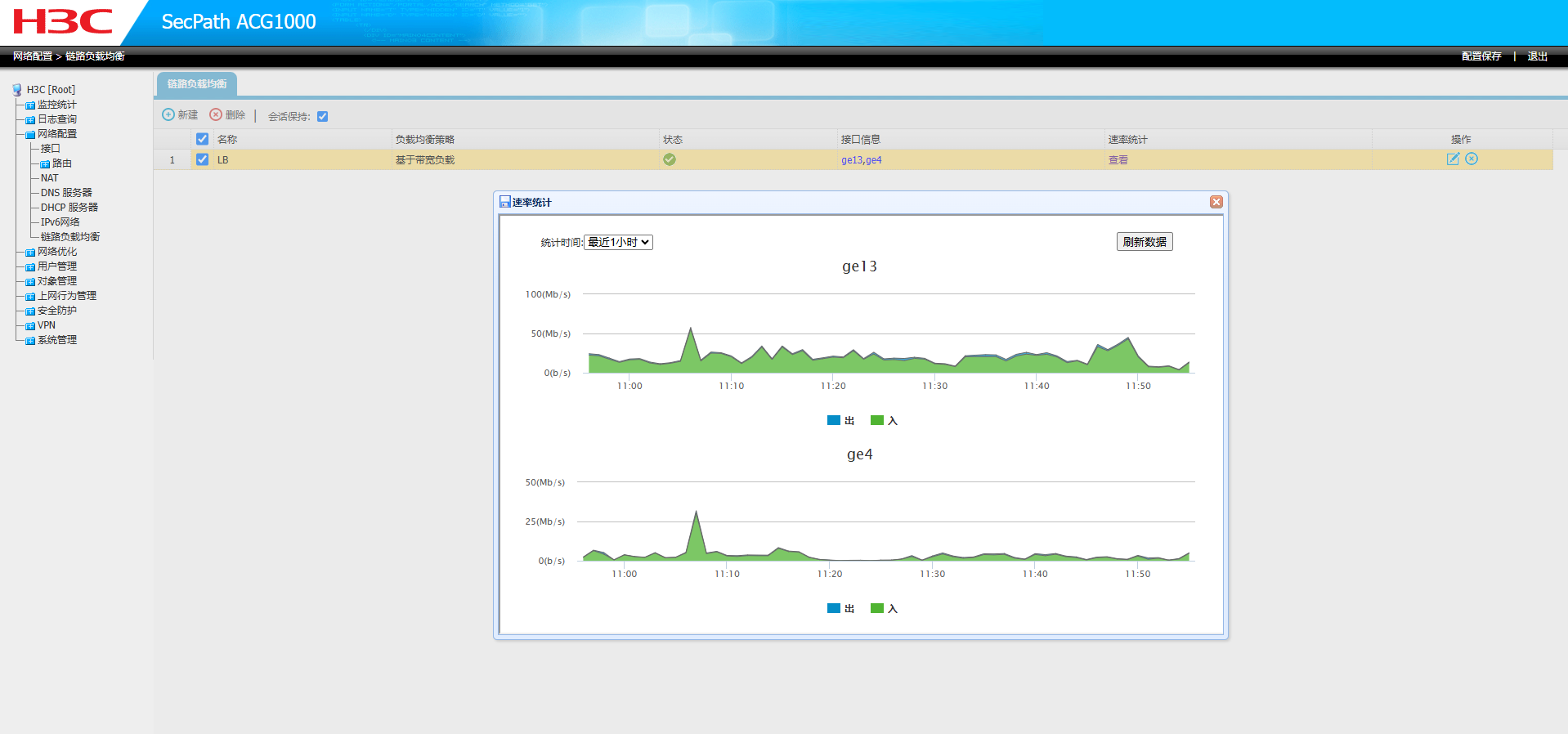 目前配置是内部无线网通过策略路由走GE12的拨号,有线网络做负载均衡走1条专线(GE4)+1条拨号(GE13)。