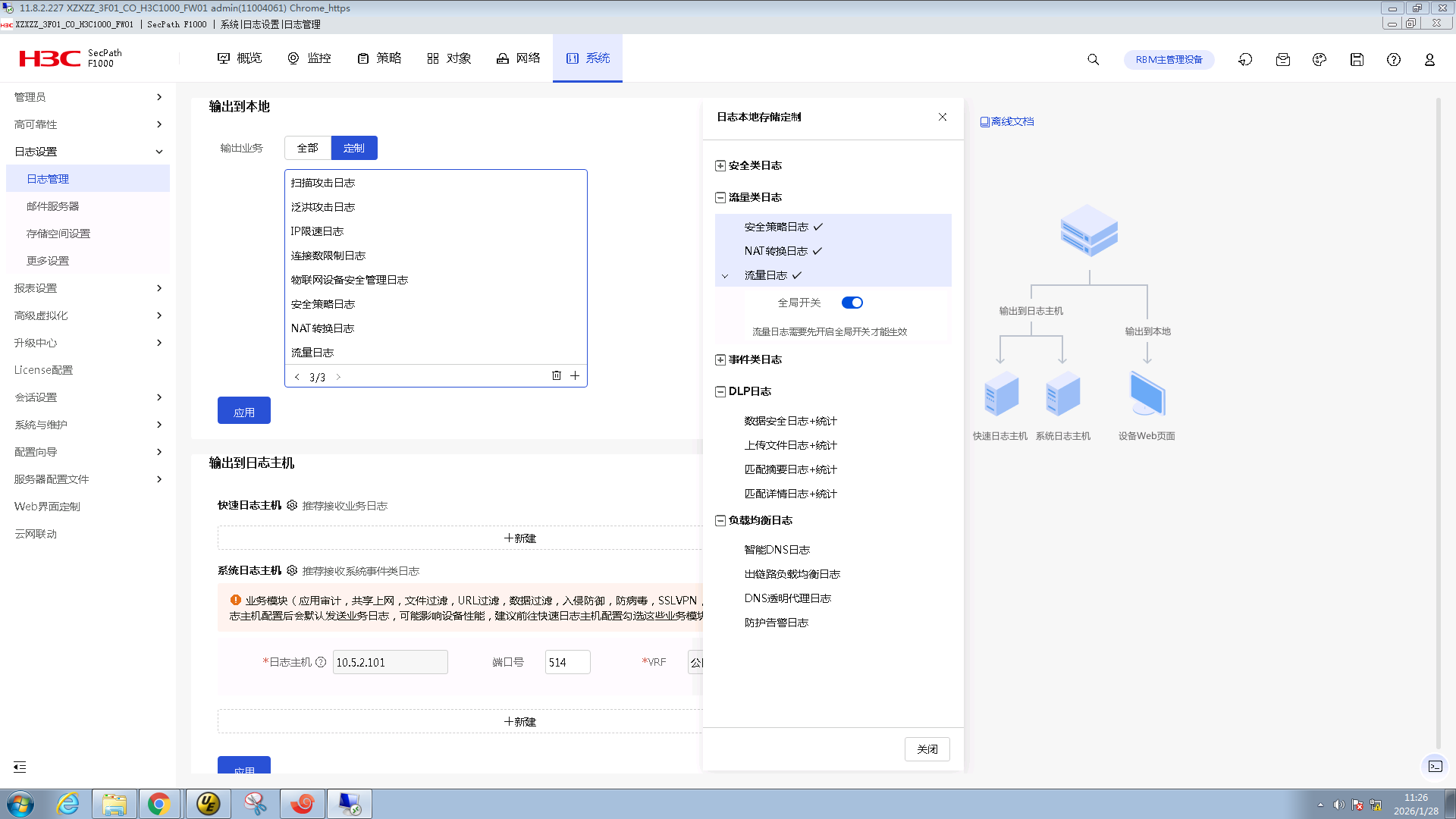 在“系统 > 日志设置 > 日志管理”页面的输出到本地区域,开启流量日志及全局开关,并在“系统 > 日志设置 > 存储空间设置”页面开启“流量监控-流量日志”的采集功能