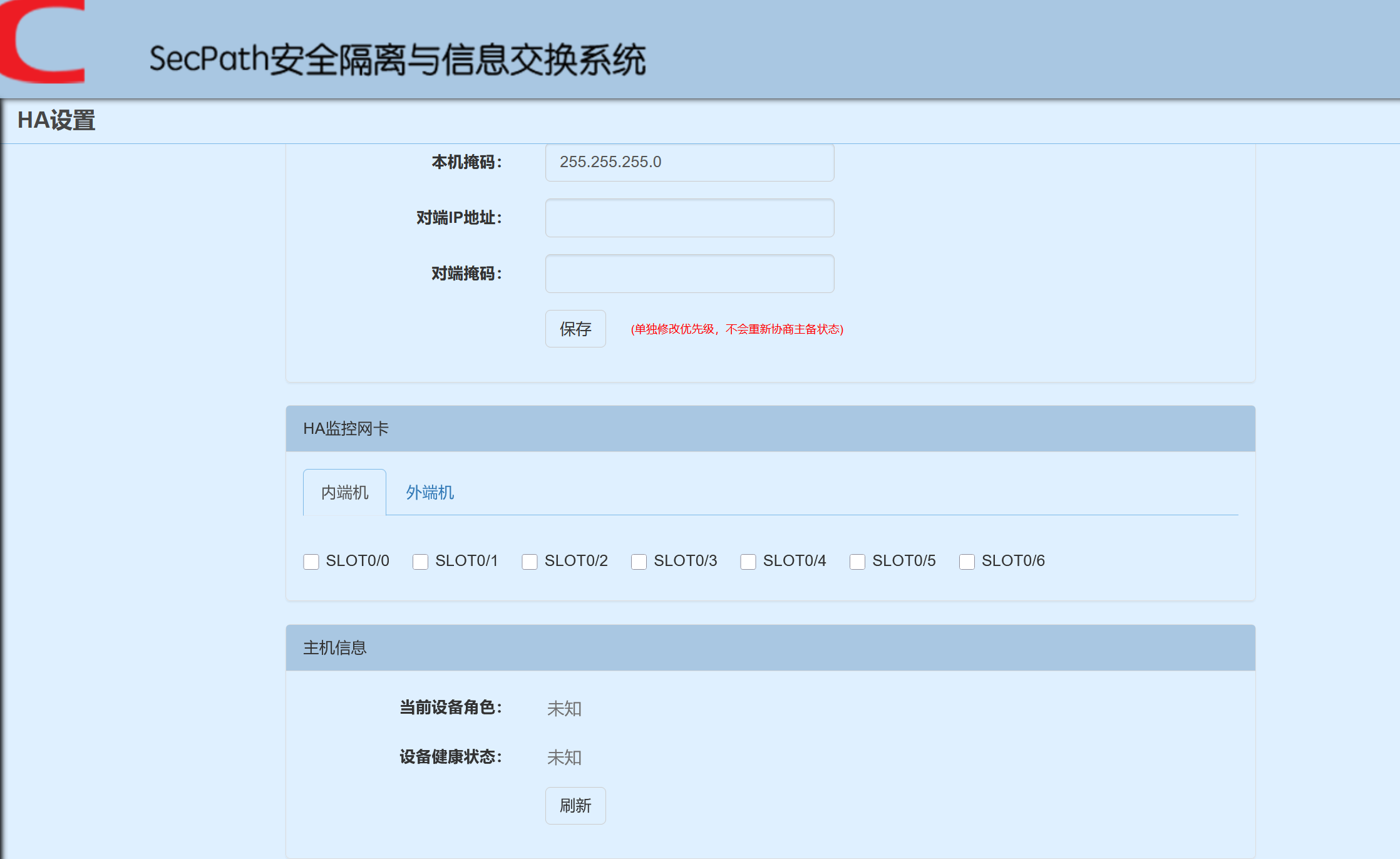 (8)     当备机执行“配置的导入导出”中的“导入”时,若此时备机优先级大于主机,则需要先拔掉备机的HA线和网线,配置导入完成后再依次插入HA线和业务网线。若此时备机优先级小于主机,则直接导入配置即可。