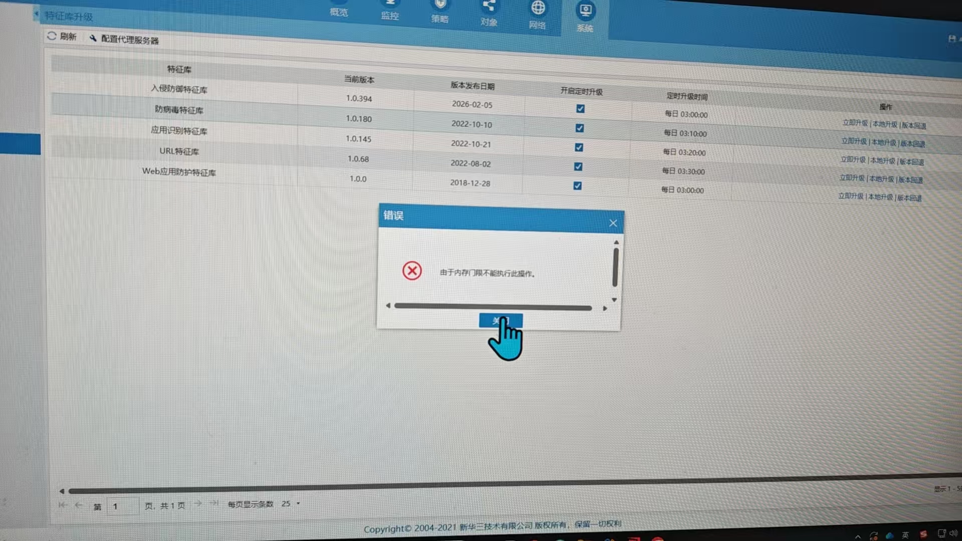 他现在就是特征库显示由于内存门限不能执行此操作。