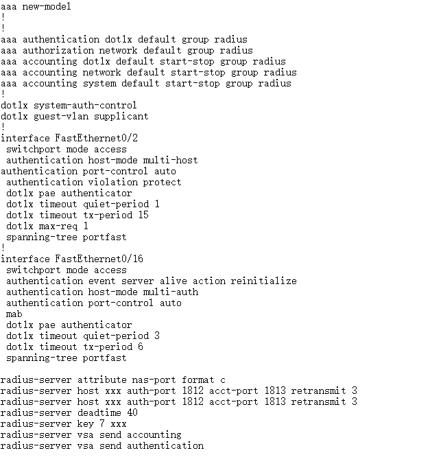 麻烦大家帮忙看下配置有没有问题,华三交换机下的电脑用iNode就可以认证成功,思科交换机下的哑终端可以认证成功,但是电脑用iNode认证就是不能上网,也看不到认证信息,fa0/2口下的配置是电脑的,fa0/16下的配置是哑终端的。
