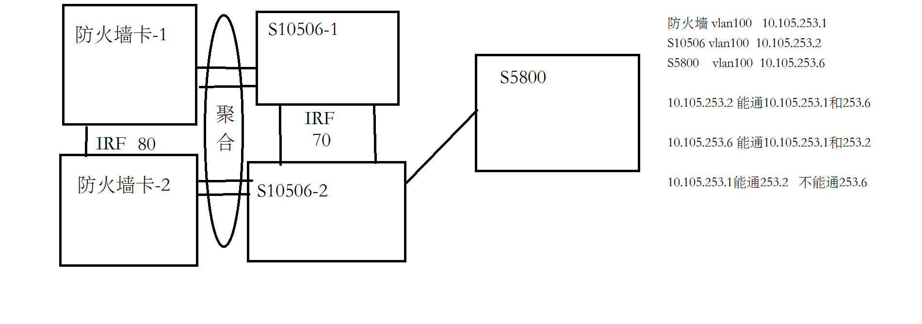 三个设备除了防火墙板卡不能ping通S5800,其他都能ping通 而且我把 S10506-2 连接防火墙板卡-2 的内连口全部shutdown后,防火墙板卡就能ping通S5800了