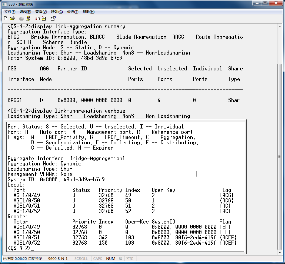 <QS-N-2>display link-aggregation summary Aggregation Interface Type: BAGG -- Bridge-Aggregation, BLAGG -- Blade-Aggregation, RAGG -- Route-Aggregatio n, SCH-B -- Schannel-Bundle Aggregation Mode: S -- Static, D -- Dynamic Loadsharing Type: Shar -- Loadsharing, NonS -- Non-Loadsharing Actor System ID: 0x8000, 48bd-3d9a-b7c9 AGG AGG Partner ID Selected Unselected Individual Share Interface Mode Ports Ports Ports Type -------------------------------------------------------------------------------- BAGG1 D 0x8000, 0000-0000-0000 0 4 0 Shar