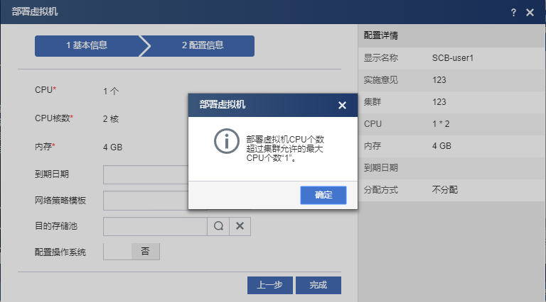 组织管理员实施用户以模板方式申请的云主机时,提示如下信息,无法完成实施步骤