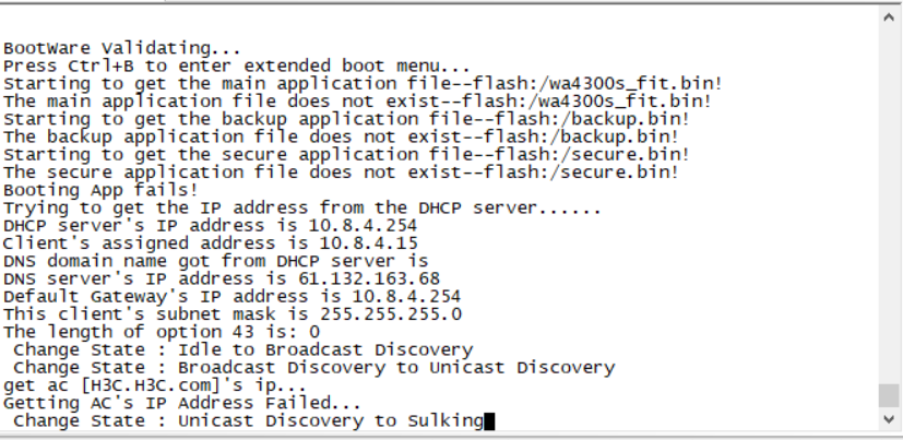 重启ap,当出现“Press Ctrl+B to enter extend boot menu...”时,键入<Ctrl+B>,系统提示: