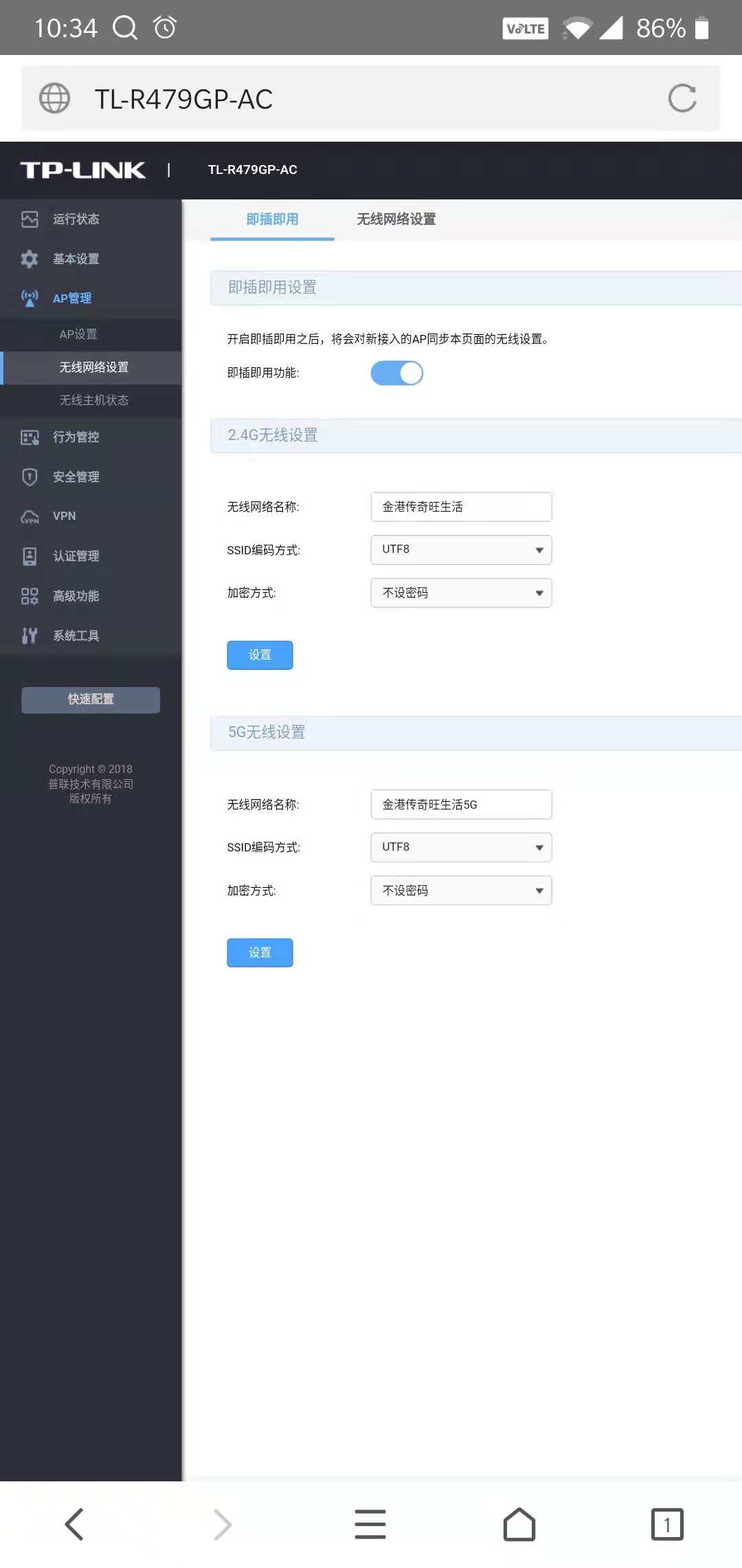 在TL-R479GP-AC中的AP管理功能中开启即插即用功能,并设置了中文的2.4G无线网络名称,设置后H3C Mini A21并不能显示设置好的中文无线网络名称,仍然显示的是H3C的英文名称。