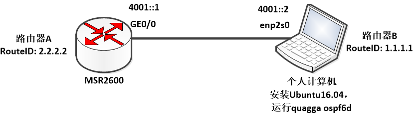 组网图如下图所示,路由器A为MSR2600,路由器B为笔记本电脑运行Unbuntu操作系统,其上运行quagga ospf6d路由(quagga介绍:***.***/quagga/,一个用于linux平台的开源路由协议软件):