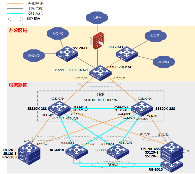 当我将 两台S5820X-28S接入到S5500-20TP-SI后,服务器区无法正常访问到办公区网络。必须关闭一台S5820X-28S才能正常访问办公网