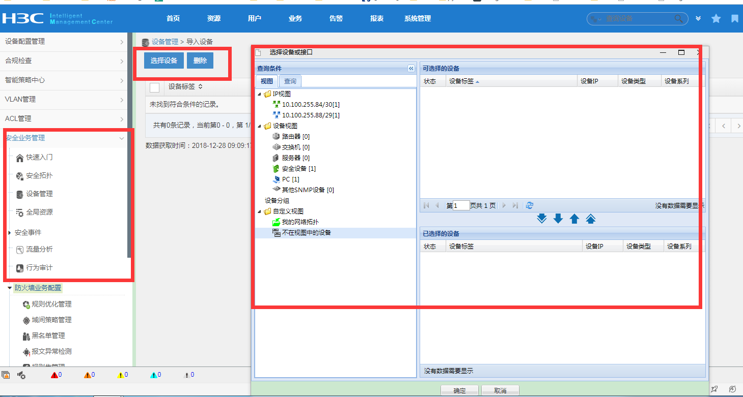 如图,我想用IMC中的SSM组件来收集设备的nat表项,现在无法 “安全业务管理”——》 “设备管理” 中添加设备;不知道该怎么才能添加进我想要收集日志的设备?