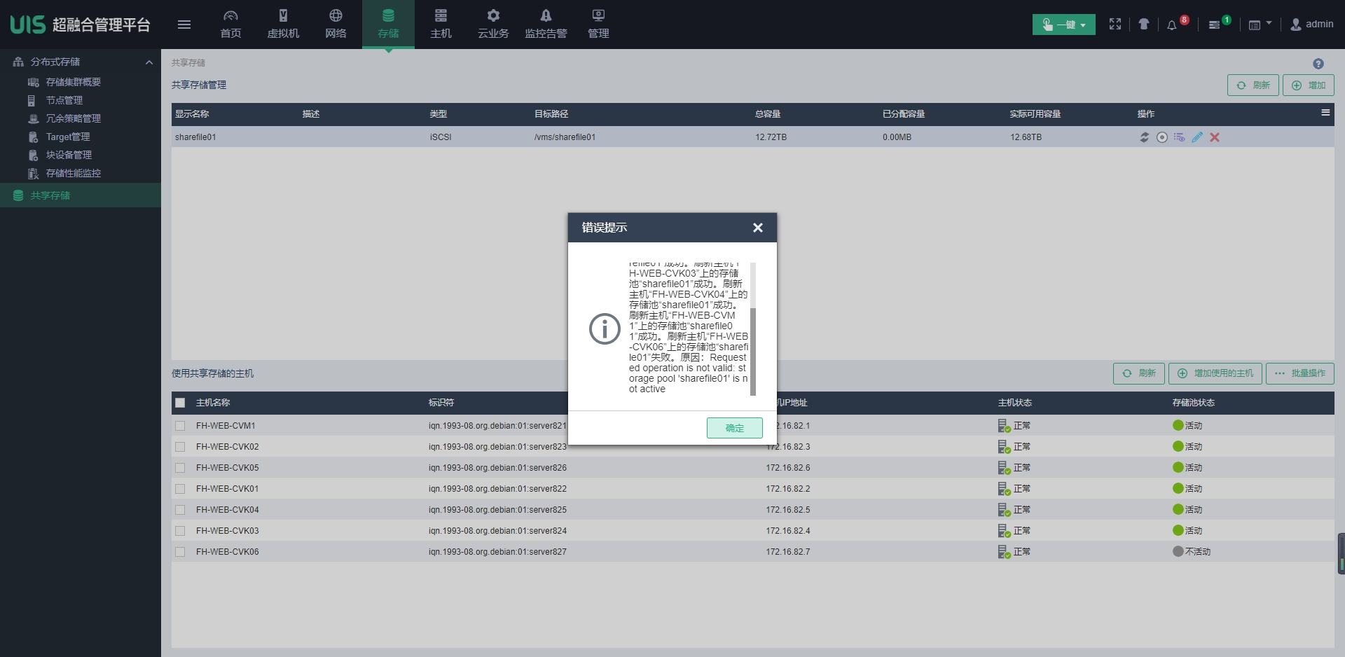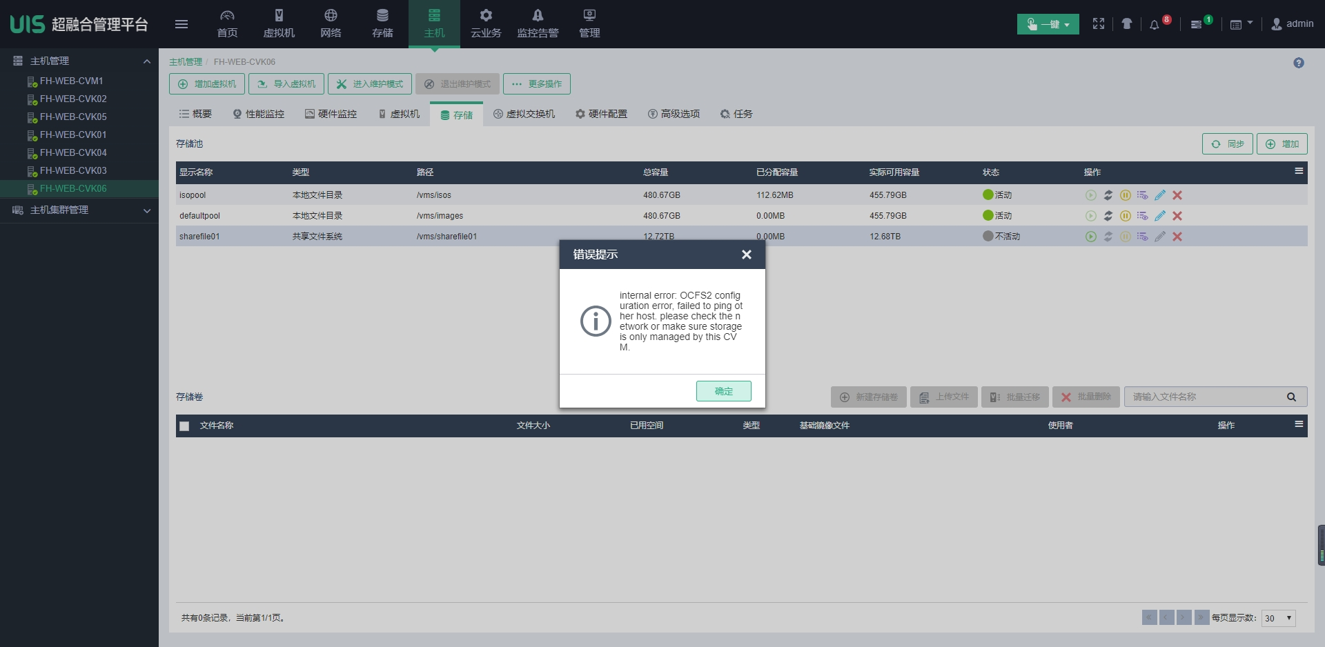 UIS开局初始化配置好分布式存储后,因为默认是2副本。删除原有自动部署的共享存储后,改用3副本,其中有1台CVK主机无法启动共享存储卷。但是实际在存储的外部网络和内部网络,此CVK都可以和其他主机互通。
