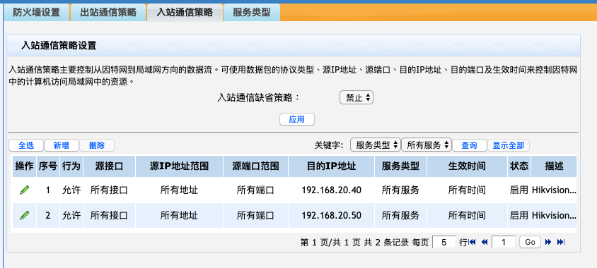 但是不知道什么原因设置了入站通信策略的话192.168.20.40(一号NVR录像机)成功可以连接,但是192.168.20.50(二号NVR录像机)连接失败。