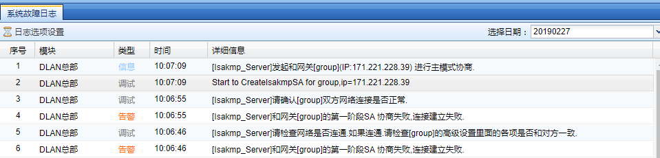 现我们集团使用深信服的AF防火墙与分公司H3C MSR2020设备进行IPSEC设备进行连接的,连接共两个子公司,之前一直没有问题,前两天突一个公司不能够连接了,对方从WEB中看到提示(ERROR_PHASEI_FAIL 第一阶段出错),在总部深信服中查询日志为(请检查网络是否连通.如果连通.请检查[group]的高级设置里面的各项是否和对方一致),但几经对比,网络为通,并且设置与对方一致,无法排除问题。对方与SCB进行连接,但不能够与GZ进行连接,总公司也能也SCB正常连接。