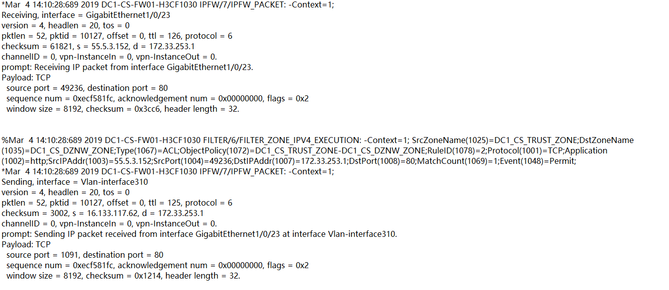 *Mar 4 14:10:38:284 2019 DC1-CS-FW01-H3CF1030 ASPF/7/PACKET: -COntext=1-Slot=2; The packet that matches no session was dropped by ASPF for nonexistent zone pair. Src-ZOne=DC1_CS_DZNW_ZONE, Dst-ZOne=Local;If-In=Vlan-interface310(206), If-Out=InLoopBack0(132); Packet Info:Src-IP=172.33.253.1, Dst-IP=16.133.117.62, VPN-Instance=none,Src-Port=80, Dst-Port=1091. Protocol=TCP(6). Flag=SYN/ACK. Seq=165891065.