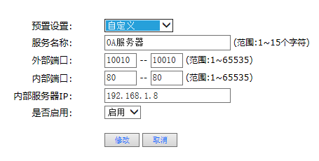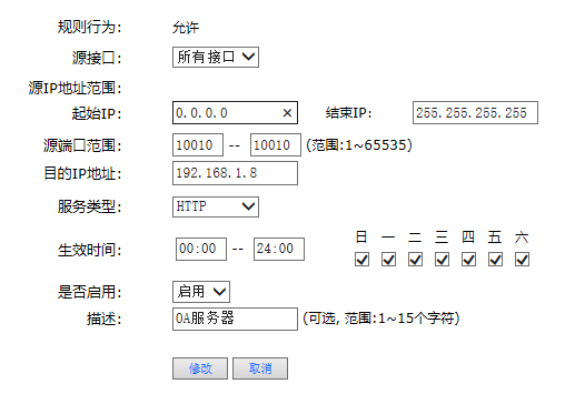 路由器WAN1口有一固定外网IP,想通过IP+端口的形式访问内网的一台WEB服务器。按照帮助文件中的说明配置了路由器,可总是无法访问。内网的 WEB服务器通过内网IP访问正常。相关配置截图如下: