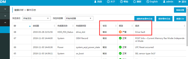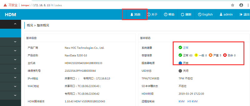 你好,能不能在图1消息或者告警信息那里做超链结直接到相关日志页面去,磁盘或者硬件坏了之后WEB页面消息提醒不够明显,容易让人忽略信息,并不是没有人天天在机房去巡检,如果在消息那里有数字明显提醒数字就更好了,建议看下友商huawei的管理WEB