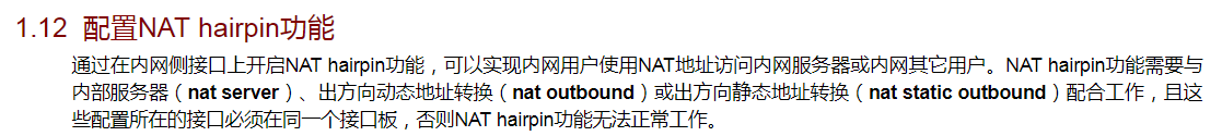 NAT hairpin功能需要与内部服务器(nat server)、出方向动态地址转换(nat outbound)或出方向静态地址转换(nat static outbound)配合工作,且这些配置所在的接口必须在同一个接口板,否则NAT hairpin功能无法正常工作。
