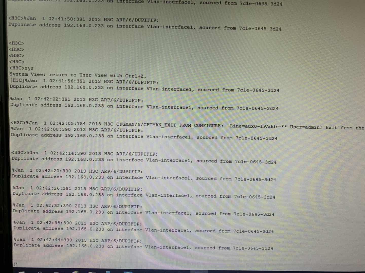 已经正常登陆了,报这个信息是说检测到地址冲突了,vlan 1 的接口地址是192.168.0.233,网络里有其它设备也设置了这个地址,有两种情况,