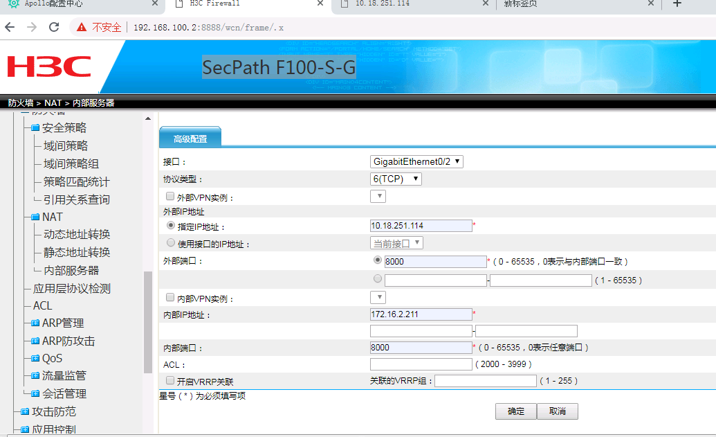 1口是WAN口 地址10.18.251.114, 2口是LAN口地址是192.168.100.2 ,服务器地址172.16.2.211