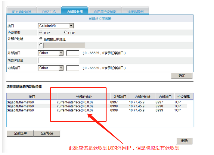 具体配置为:GigabitEnthernet0/0==TCP==当前接口IP地址==外部端口8999==内网ip10.77.45.2==内部端口8999