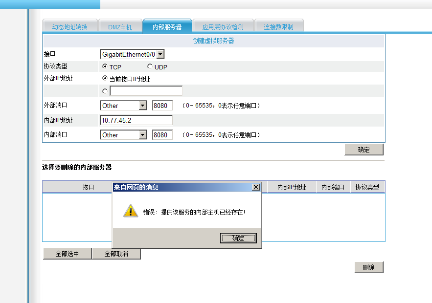 一个外网ip的端口,只能同时映射给一个内网ip,您的图片标的已经很清楚了,8999端口已经映射给10.77.45.9了,如果想映射给10.77.45.2,删除10.77.45.9的映射