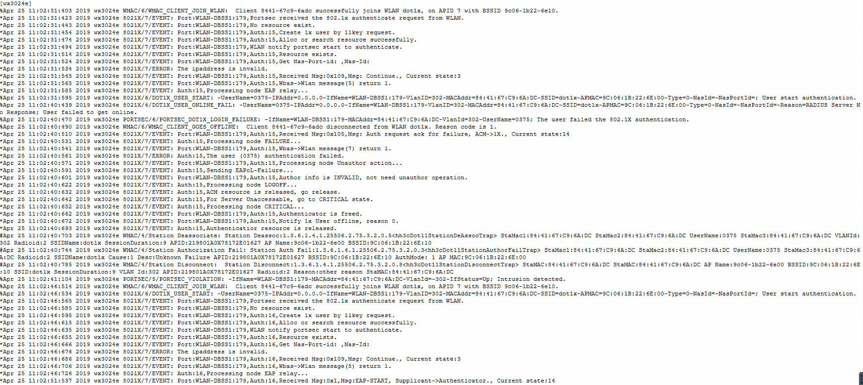 *Apr 25 11:03:04:902 2019 wx3024e 8021X/7/EVENT: Auth:17,Processing node CRITICAL...
