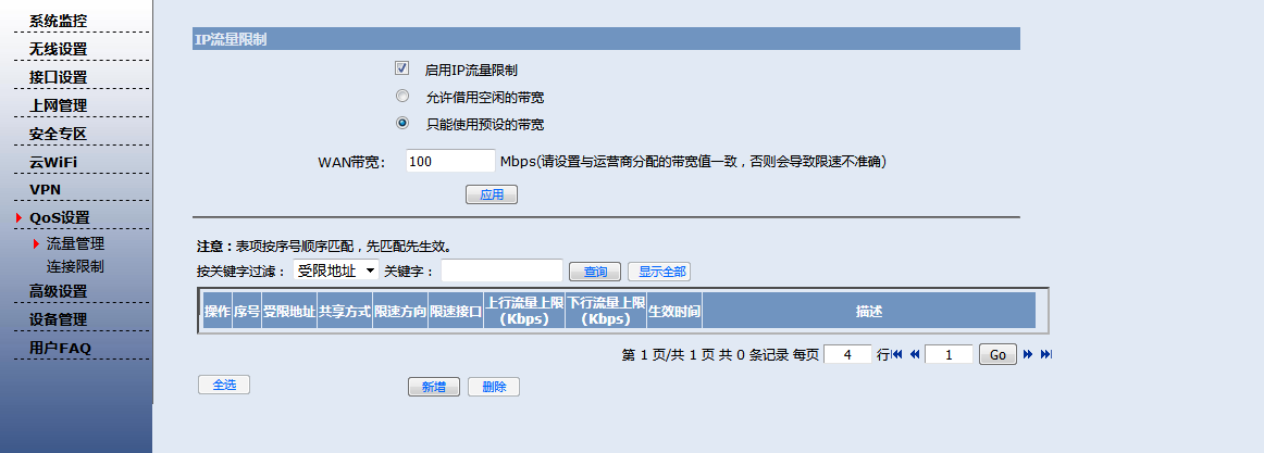 在QoS设置——流量管理——IP流量设置里面不能进行设置,之前我可以设置,之后不能编辑,我就进行删除了,现在还是编辑不了~~~