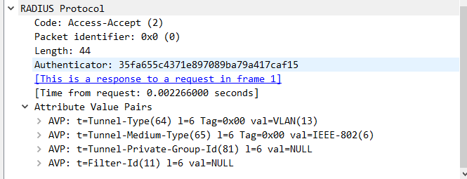 查看了RFC2865,RFC2866,RFC2868,猜测属性值中,type=13是扩展类型,隧道协议走的vlan协议,不清楚交换机怎么解析出错了,求助!!!谢谢!!!