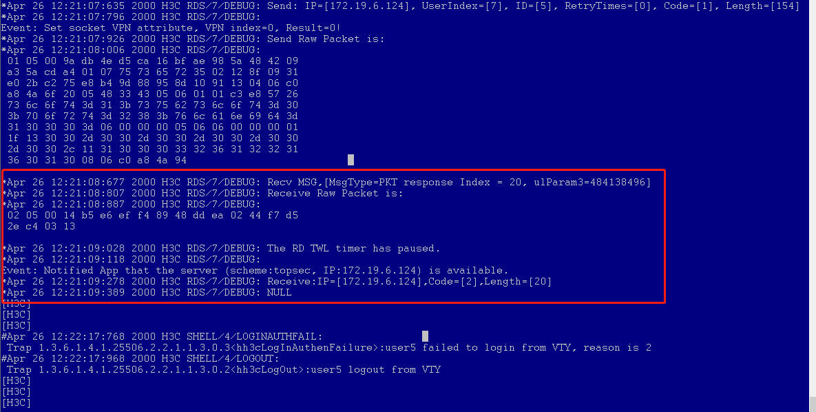 之前发过一个关于求助帖,https://zhiliao.h3c.com/questions/dispcont/51028,目前问题已经找到,是认证服务器回复的radius报文中回复的vlan字段value为NULL,导致交换机解析出错。目前已经将vlan属性等去除。交换机目前还是telent登陆认证失败,交换机调试信息如下: