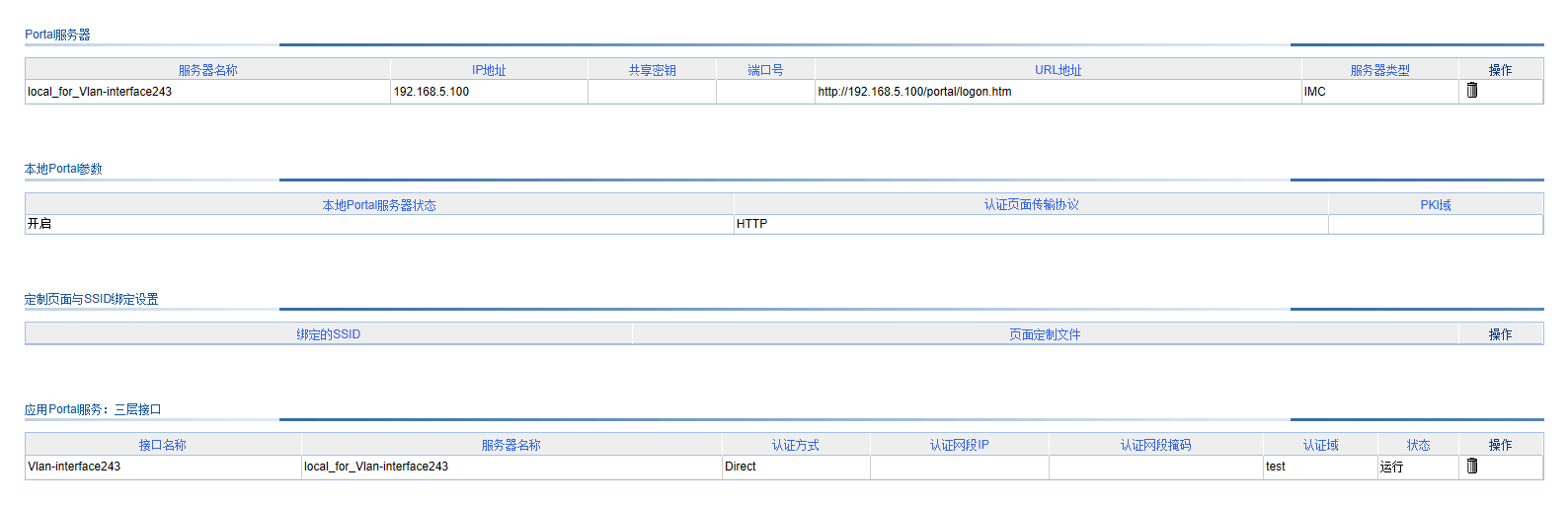 <WX2620WF>dis portal server Portal server: 0)local_for_Vlan-interface243: IP : 192.168.5.100 Port : 50100 Key : Not configured URL : http://192.168.5.100/portal/logon.htm Server Type : IMC Status : N/A