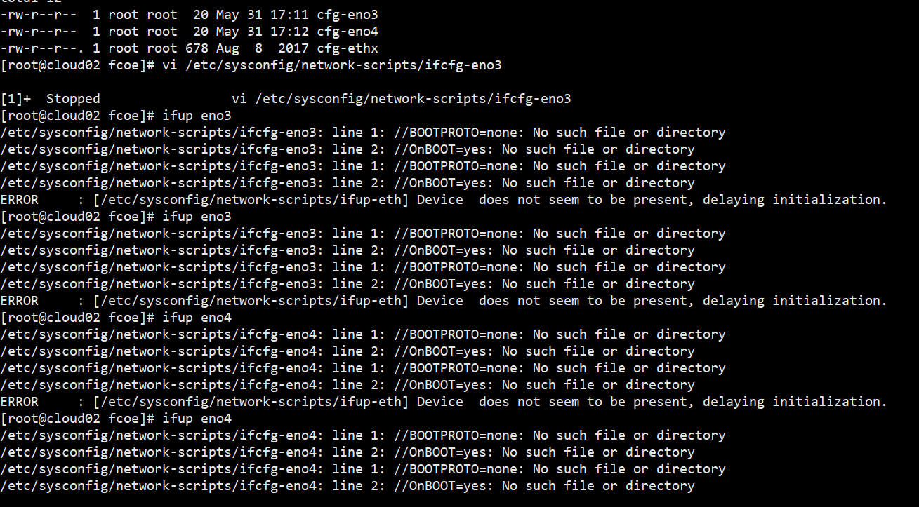 服务器为uis-8000刀片,通过vc映射给服务器的fcoe存储,https://zhiliao.h3c.com/Theme/details/24130 ***.***/z/q880019514.htm根据知了中提到需要yum安装fcoe,由于我的服务器无法连接外网,所以我挂载的为Centos7.0/7.4/7.5进行安装,然后提示[root@cloud02 ~]# yum install fcoe-utils Loaded plugins: fastestmirror Loading mirror speeds from cached hostfile Package fcoe-utils-1.0.32-1.el7.x86_64 already installed and latest version Nothing to do,有了一个,现在我可以看到/etc/fcoe这个目录,但是里边是空的,之后继续安装知了中进行部署在执行完ifup eno3后提示:/etc/sysconfig/network-scripts/ifcfg-eno3: line 1: //BOOTPROTO=none: No such file or directory /etc/sysconfig/network-scripts/ifcfg-eno3: line 2: //OnBOOT=yes: No such file or directory /etc/sysconfig/network-scripts/ifcfg-eno3: line 1: //BOOTPROTO=none: No such file or directory /etc/sysconfig/network-scripts/ifcfg-eno3: line 2: //OnBOOT=yes: No such file or directory ERROR : [/etc/sysconfig/network-scripts/ifup-eth] Device does not seem to be present, delaying initialization.之后执行fcoeadm -i命令也是不成功的,提示:fcoeadm: No action was taken Try 'fcoeadm --help' for more information.有人可以告诉我那设置的不对吗。