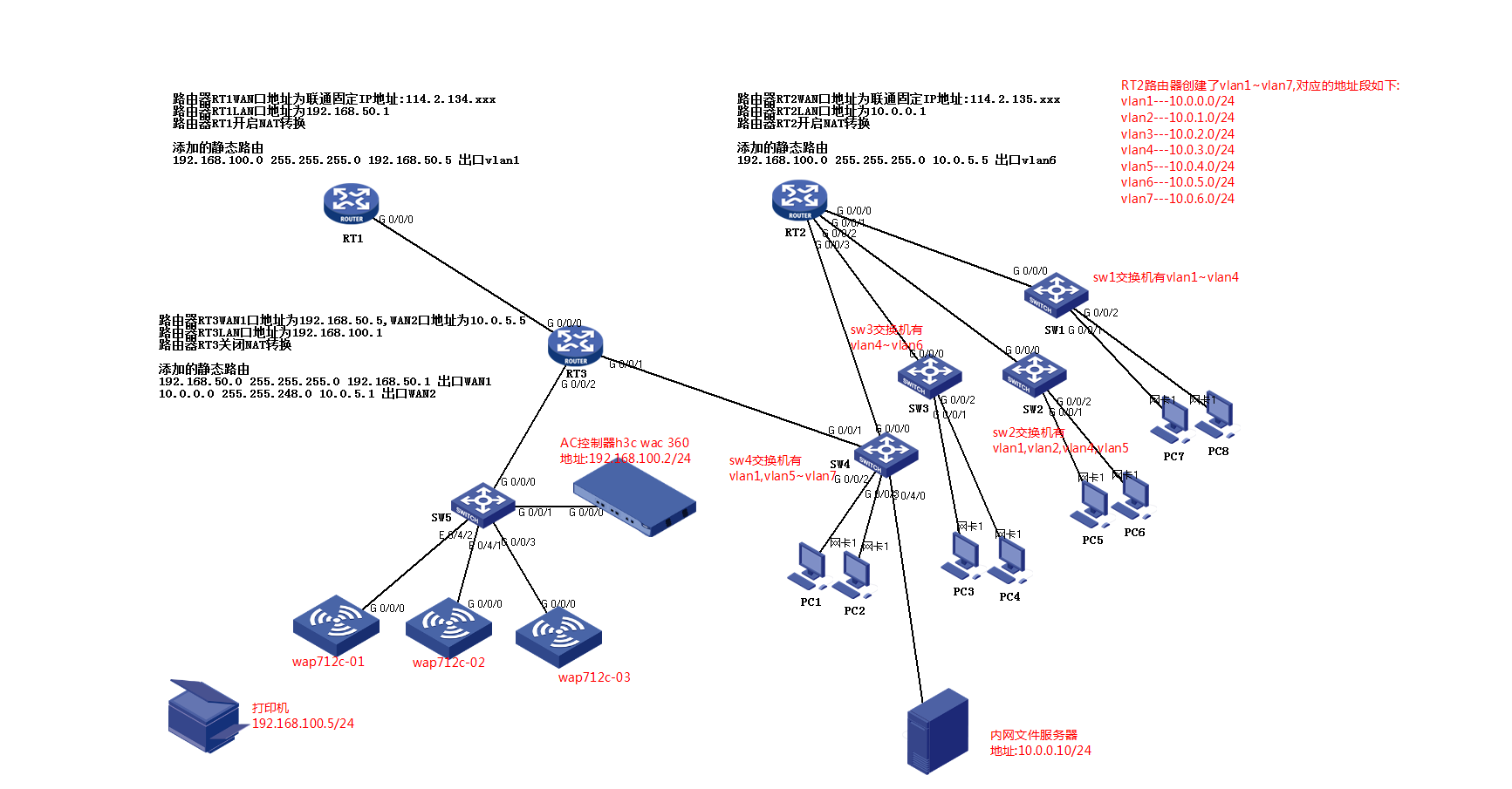 SW1~SW4这4台交换机的带机量共200多台,这些交换机都需要访问内网文件服务器,还有通过无线连接的打印机,因此RT3我关闭了NAT转换,RT1、RT2、RT3都写有静态路由表,如拓扑图所示。