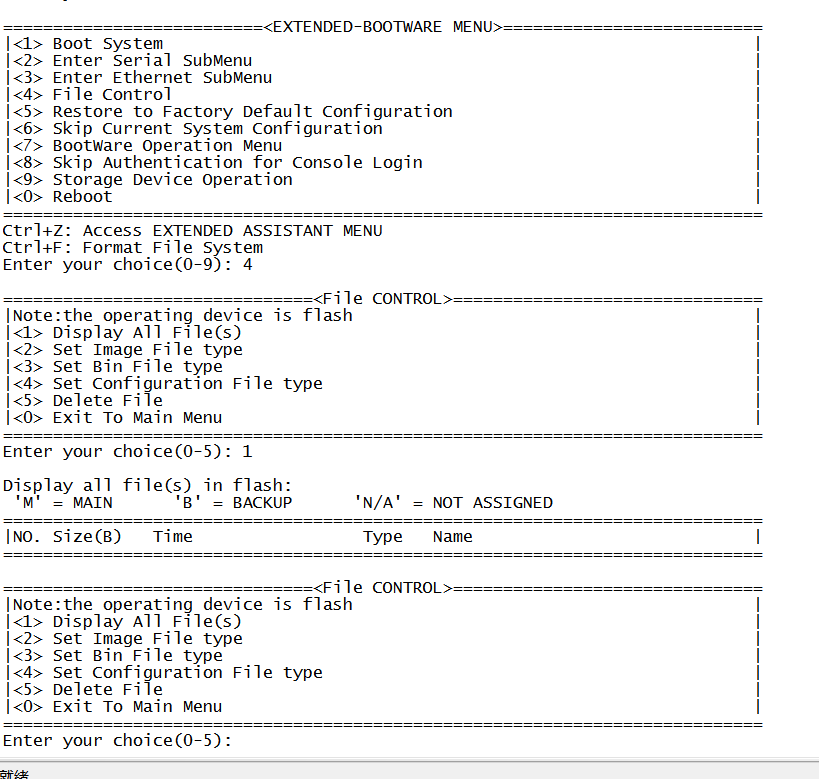 #在设备启动过程中,当出现“Press Ctrl+B to enter extended boot menu...”时,立即键入<Ctrl+B>,按下<Enter>键后,系统将进入BootWare主菜单。