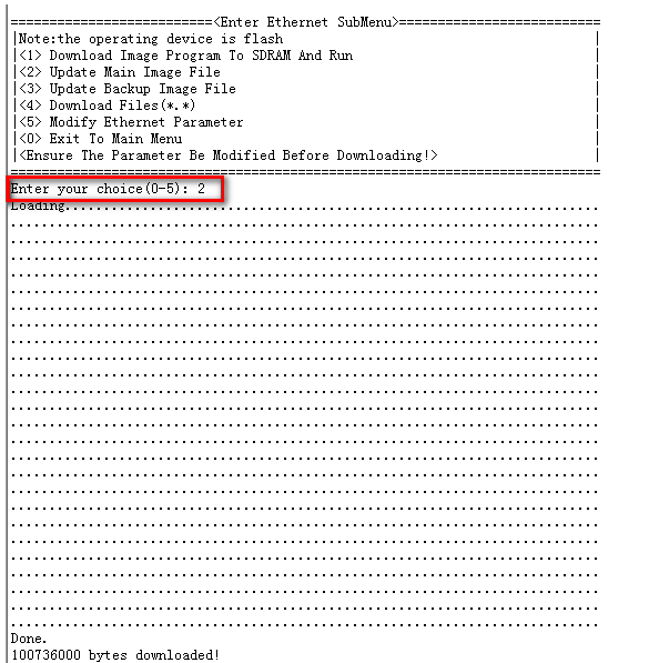 #回到以太网菜单后,选择<2> 升级主应用程序,等待版本下载完成
