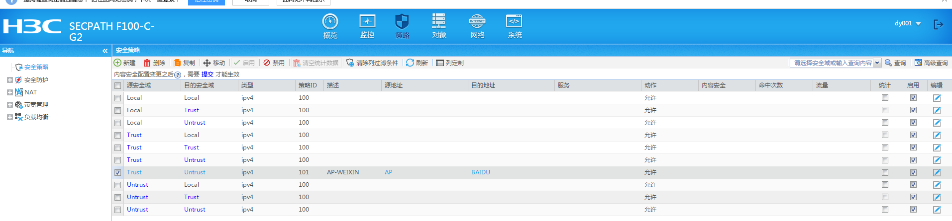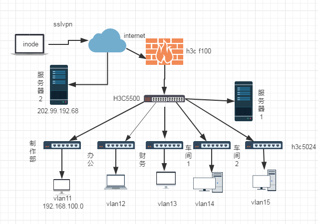 如何在防火墙F100上配置: 制作部vlan 11(192.168.100.0) 只登录服务器2 (202.99.192.68)不能上外网