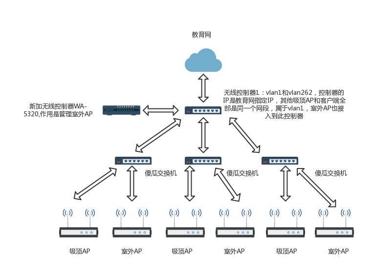 我发过了帖子,但是没有回答,我画了网络拓扑图如下:有2个无线控制器,一个是H3C5560交换机升级来的,作用是管理吸顶无线AP和学校其他电脑。室外AP型号是5320-X,因为5560不支持这款AP,所以学校重新购买了2510无线控制器,用来管理室外AP。现在问题是如何才能启用室外AP?