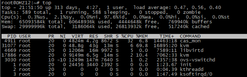 各位大神老师,CAS虚拟化平台出现以下问题:物理节点的内存(总内存64GB)使用率异常高(95%以上),但是该物理节点下一共两台虚拟机其中一台内存分配8GB,内存使用率25%,另外一台虚拟机内存分配内存48GB,使用率为10%。登录物理节点输入命令top,显示内容如附件图,其中一个叫kvm的进程内存占用了为69.8%,比较异常。中间有尝试将该节点下的两台虚拟机先迁移到其他物理节点,然后再迁移回来,此时该物理节点的内存使用率下降到40%以下,感觉还算比较正常。请问这是什么原因呢,求大神解答!