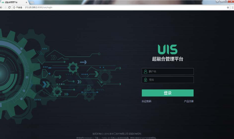 推荐使用Chrome49+版本, 在地址栏中输入管理IP地址,http://<UIS-Cell的管理IP地址>:8080,进入UIS超融合管理平台登录界面,如下图所示:
